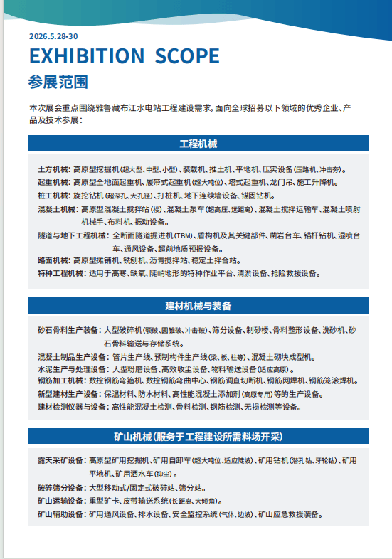 2026雅鲁藏布江水电坐扶植暨工程机械博览会招展工做全面启动,大咖云集,共线雅鲁藏布江水电坐扶植暨工程机械博览会